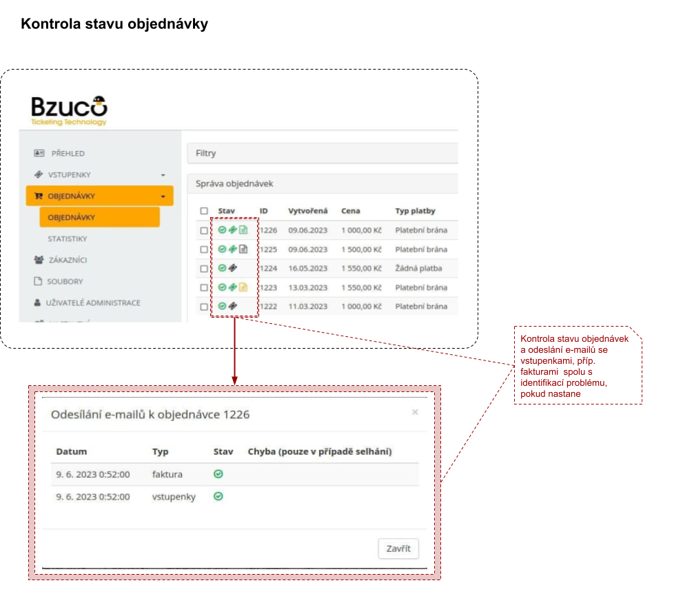 Stav odesílání e-mailů se vstupenkami či fakturami je možné kontrolovat přímo v administraci objednávek, stejně jako je to možné dělat u stavu objednávek. Kontrolu můžete provést sami během několika okamžiků. Celý postup pro práci s případnými problematickými objednávkami naleznete na stránkách zde.