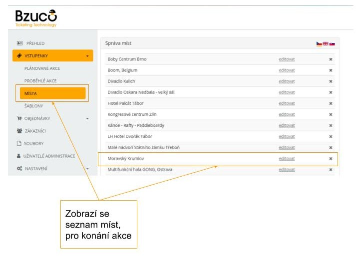 V sekci Místa naleznete seznam možných lokací pro konání Vašich akcí. Místa pro konání akce je možné rozdělit do dvou kategorií a to na místa pro akce na stání nebo na sezení, tedy akce konající se v sále. Při tvorbě akce je nutné zvolit příslušné místo jejího konání.