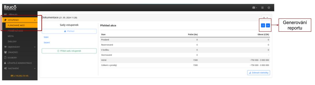 Následně se dostanete do správy vstupenek vybrané akce, kde stáhnete report vstupenek.