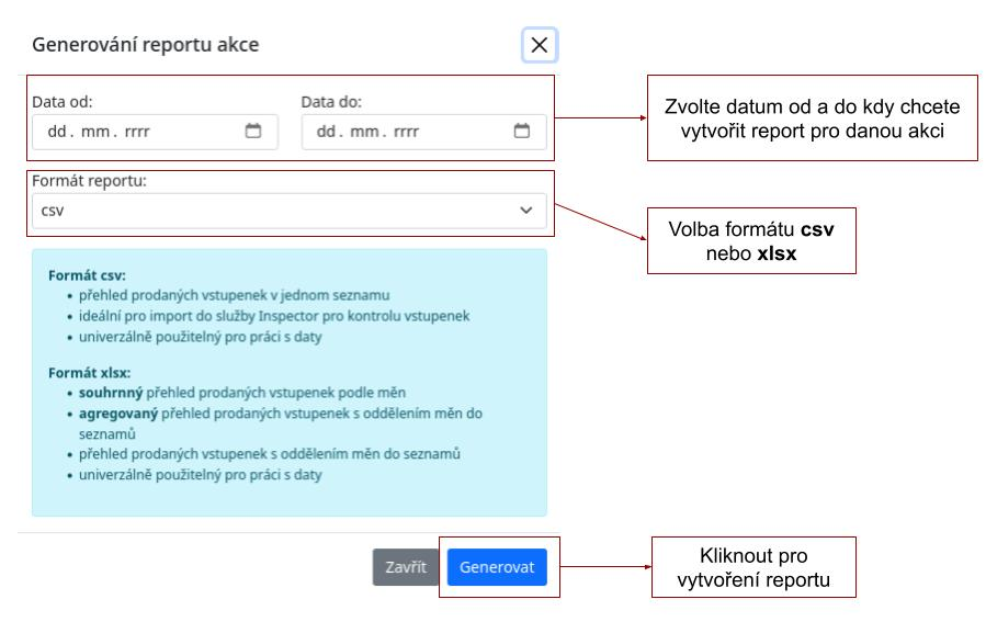 Rozbalí se tabulka, kde si v vyberete data od kdy do kdy chcete daný report vytvořit a zvolíte formát generovaného souboru. Na výběr máte mezi CSV a xlsx.