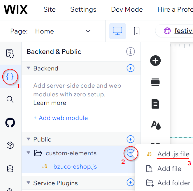 - V editoru Wixu vytvořte soubor s názvem bzuco-eshop.jsve složce custom-elements: