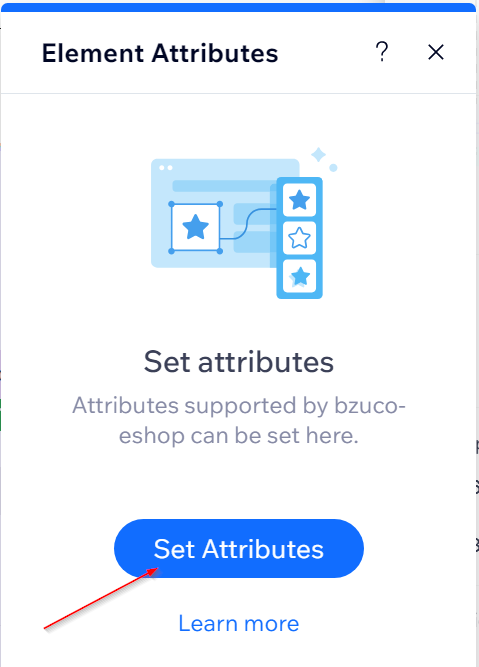- V editoru Wixu klikněte na váš nově umístěný Custom Element a následně na tlačítko “Set Attributes”. V zobrazeném dialogu klikněte na tlačítko “Set Attributes”. Zadejte nový atribut s názvem instance, do “Value” vyplňte název vaší BZUCO instance a potvrďte tlačítkem “Set”.