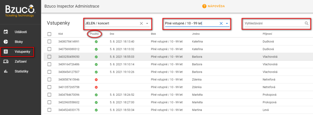 - Pokud je ve sloupci "Použitá" zelená "fajfka", byla vstupenka už jednou použita.